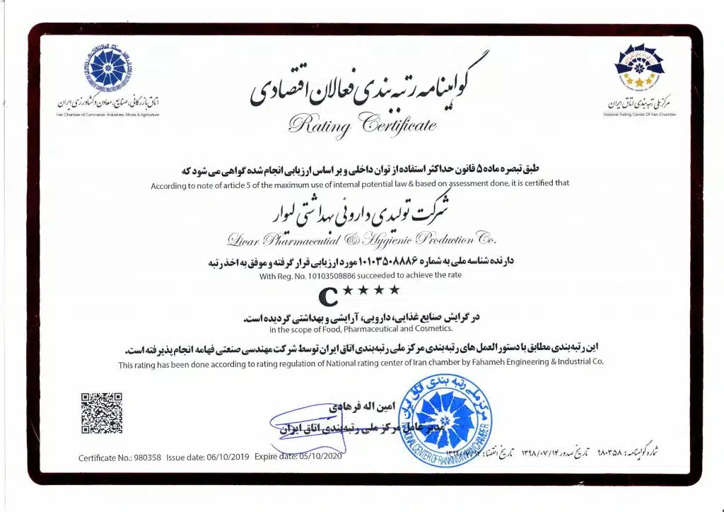 گواهینامه رتبه برنزین شرکت دارویی بهداشتی لیوار